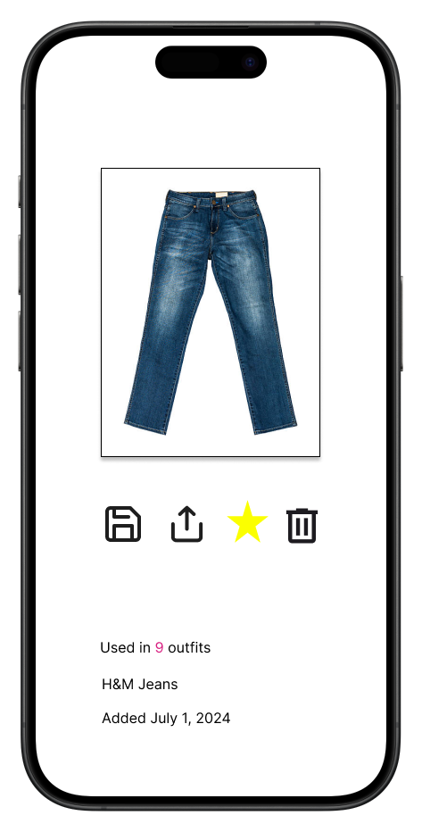 Clicking on a specific picture of a clothing item, would allow you to delete it from the closet, pin it to the top by starring it, share it to events or your feed, add it to another outfit, see when it was added, how many outfits is it used in, and optionally where you got it from