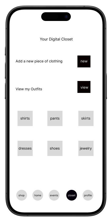 On the homepage of closet, you can view the categories your clothing pices are in, view your outfits, and add new pieces of clothing to your closet